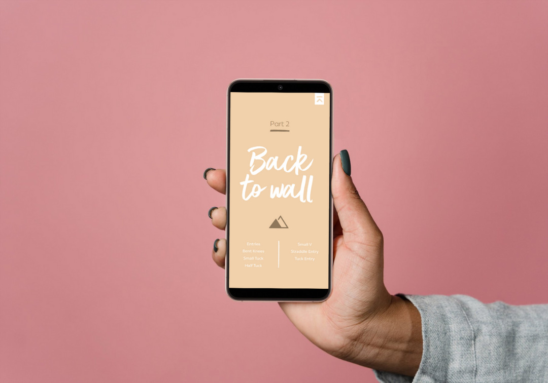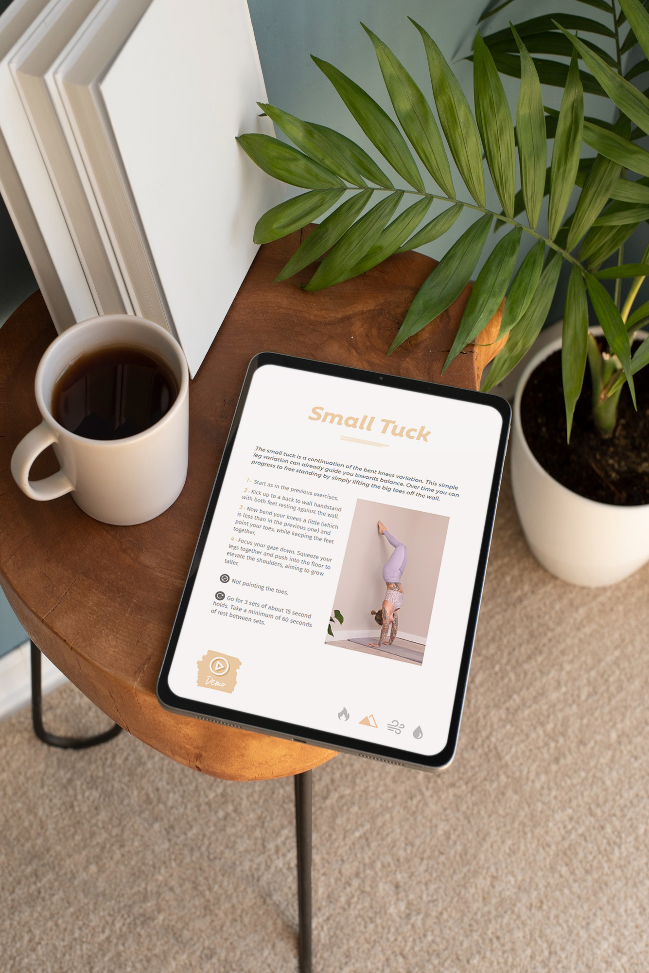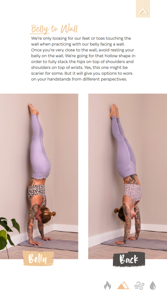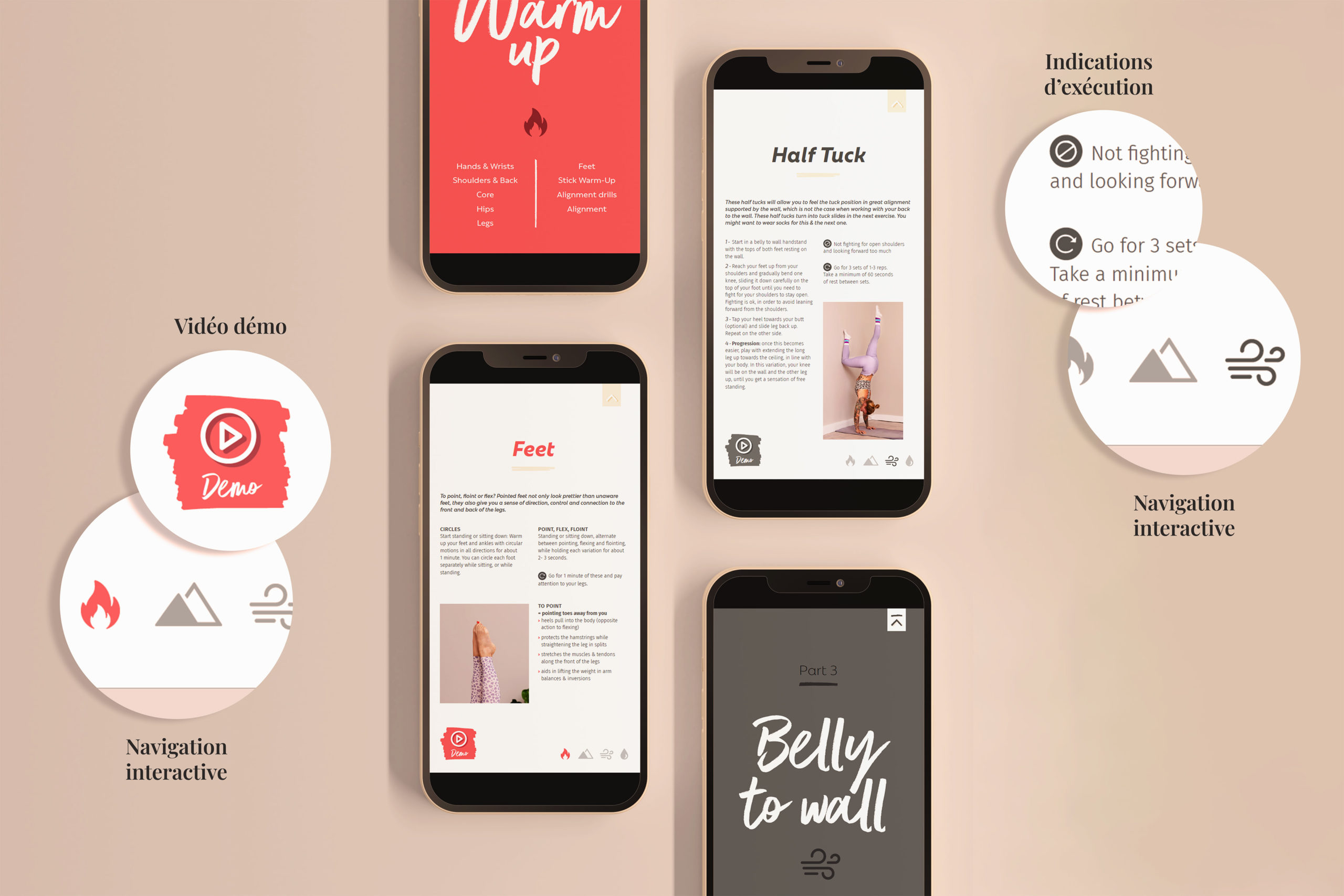 Le processus d’apprentissage du handstand est long et exigent. Nous avons donc travaillé ensemble un support pédagogique digital facile d’utilisation grâce à une navigation interactive, des menus intermédiaires cliquables, des vidéos démo Viméo ou bien encore des liens vers des pages web au contenu approfondi annexe. La structure des pages du eBook guide pas à pas le yogi débutant afin qu’il ne grille aucune étape du processus.